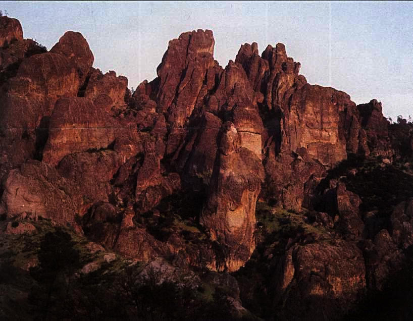 Pinnacles National Monument (photo from the visitor's guide, by Frank S. Balthis). This park is about 35 miles south of Hollister, along Hwy. 25. Entrance fees are $2 per bike, $4 per car. The park has picnic areas, hiking trails, and caves.