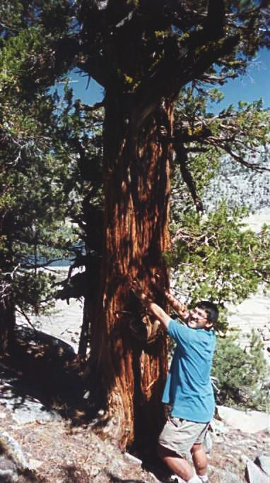 This tree's bark had been shredded, probably by a bear who wanted to sharpen his claws. Peter demonstrates that he can only reach about half as high as the bear claw marks.