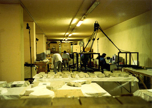 ++ Another picture of us at work. On the right you can see our "photograph station", where we took digital photos of each fragment that we scanned. |