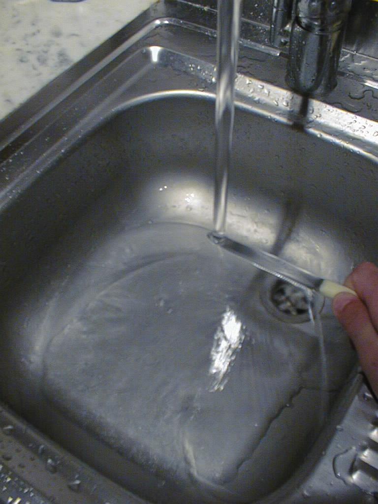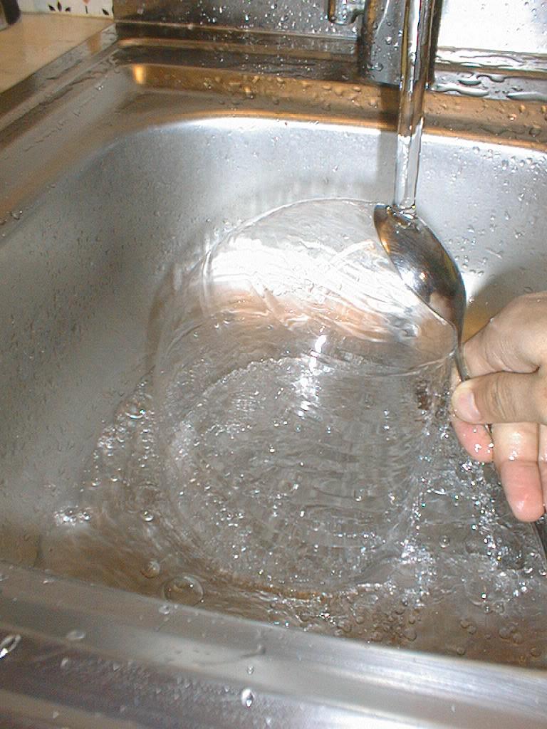 Turning the spoon right-side-up causes the water to