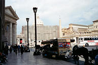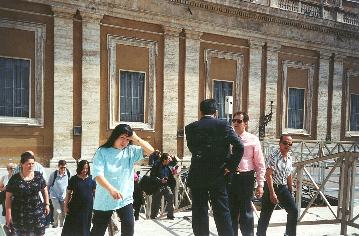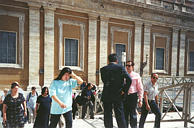 ++ Approaching the entrance to St. Peters, you pass the clothing police (The guy in the dark suit with his back turned). The clothing police stood on the steps, turning back any women who dared attempt to enter St. Peters in shorts. Out in the piazza, many vendors did good business selling wrap-around skirts... |