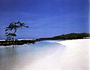 "There was a small white beach of extremely fine sand, deposited by millions of Pacific Ocean tides between two towering dark lava cliffs. The beach was smooth and shiny in the morning sun. THe only marks on its surface were the large webbed prints where a pelican had landed, then walked to the water's edge..."
