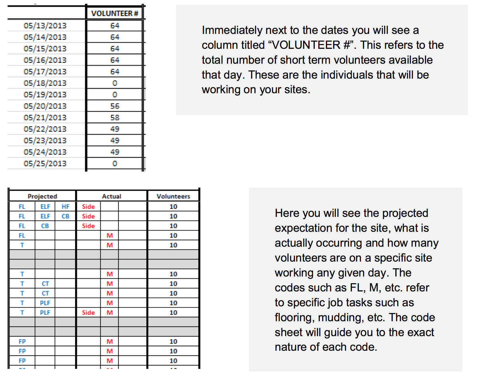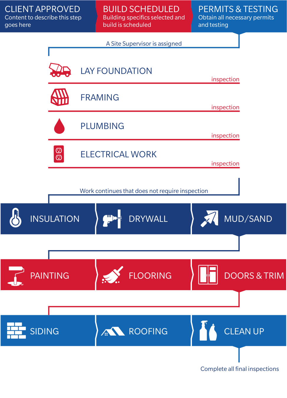 Site supervisor: Oversees the training and supervision of the short-term volunteers. The site supervisor must ensure they stay on course with the plan for the property. They must verify that all required inspections are completed before moving on to additional items. They must stay in contact with the client, keep them updated and notified regarding the status of the build.