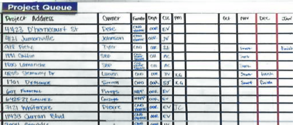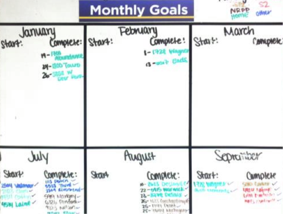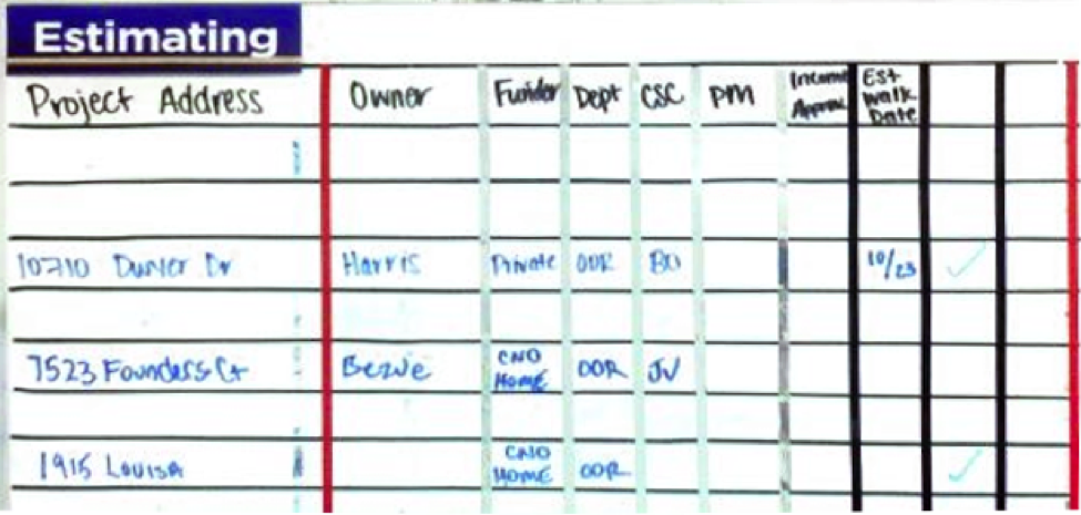 The construction coordinator in consultation with the construction estimator and director will update the board. When estimation and income approval (as required) are complete, and the feasibility is determined, projects will move from the estimating side of the board to the project queue. Start and finish goals by month are projected, along with the assignment of a project manager. Projects will move out of the project queue once funding and scope of work are approved, and “notice to proceed” is issued. (Data for the boards is retrieved from each board’s respective construction report tab.)