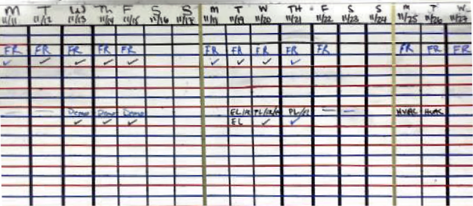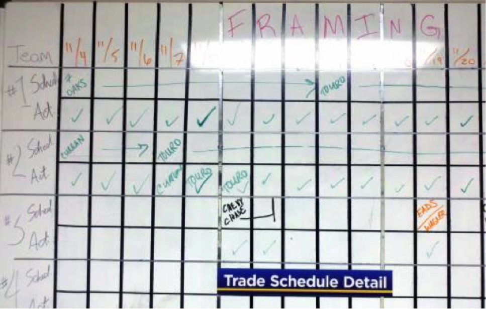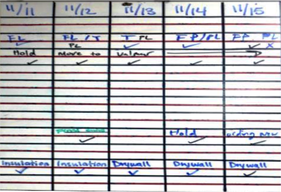 The board will be updated by the trade managers and trade team daily, or as variances occur by confirming with a checkmark or negating with an X. Changes resulting in variances should be discussed with construction team if variance/extension would be needed on main the “trades schedule,” used by the project managers. (Data transfer into the master trades schedule is completed by construction coordinator weekly.)