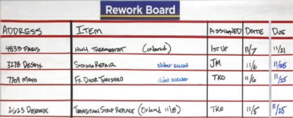 The board will be updated by the construction coordinator after processing daily work-orders by listing the project address, short description of items, the assignment to appropriate or responsible party (project manager, trades team, or subcontractor,) the date entered and a deadline.
