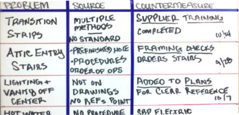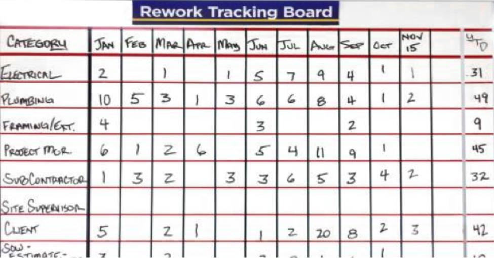 As items are completed they are recorded in Salesforce (or your selected program) and this data is tallied each month. Results by category are detailed on the rework tracking board each month. Analyzing the data for patterns, repeat occurrences, significant single occurrences results in identified problems requiring going to the source of the occurrence to determine an ideal countermeasure. During construction team meetings a timeframe will be determined for proving a countermeasure has provided an ideal solution.