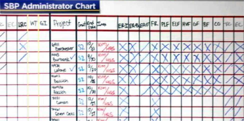 The board will be updated by the construction coordinator daily as projects start and closeout, items (such as inspections) are completed, paper work is received, or completion deadlines are changed. Items completed are marked with an X or half mark, if ordered and not yet received.